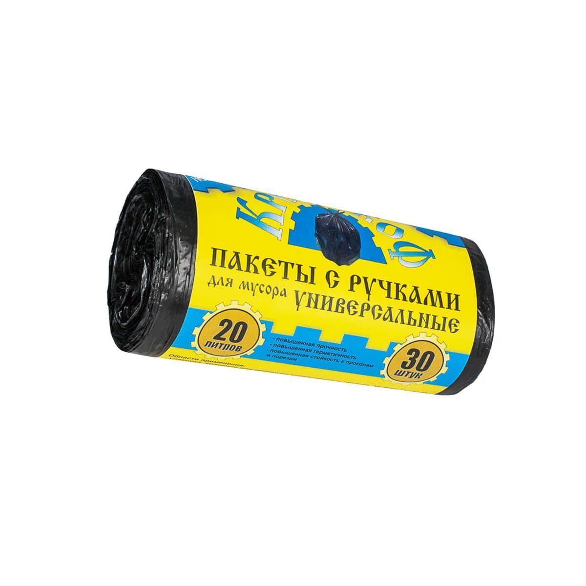 Мешки для мусора 20 л, с ручками, черные, в рулоне 30 шт., ПНД, 10 мкм, 550х440 мм, Крепакоф, 4607075710658