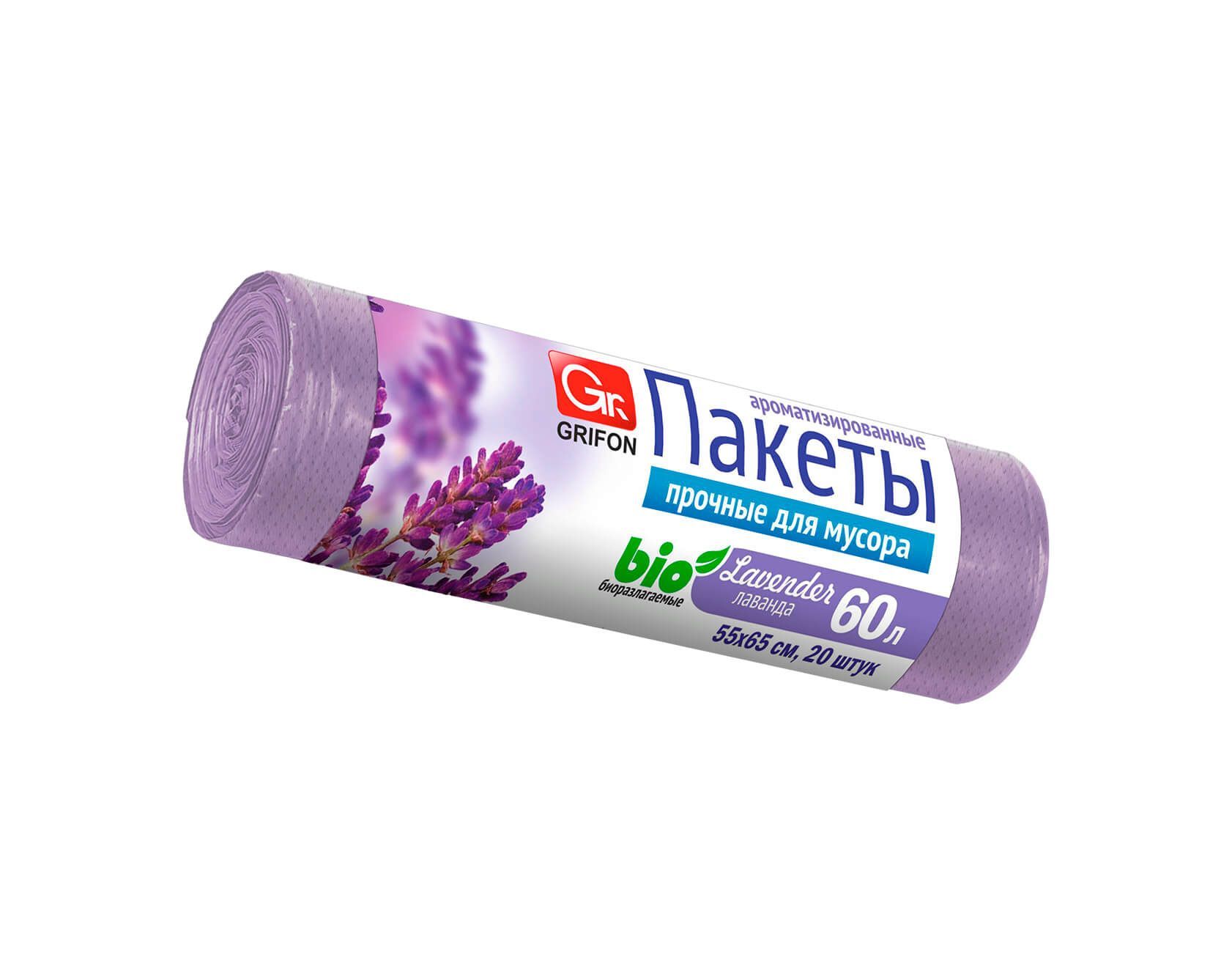 Мешки для мусора 60 л, ароматизированные, Лаванда, сиреневые, в рулоне 20 шт., ПНД, 9 мкм, 650х550 мм, GRIFON Aroma, 101-023 La