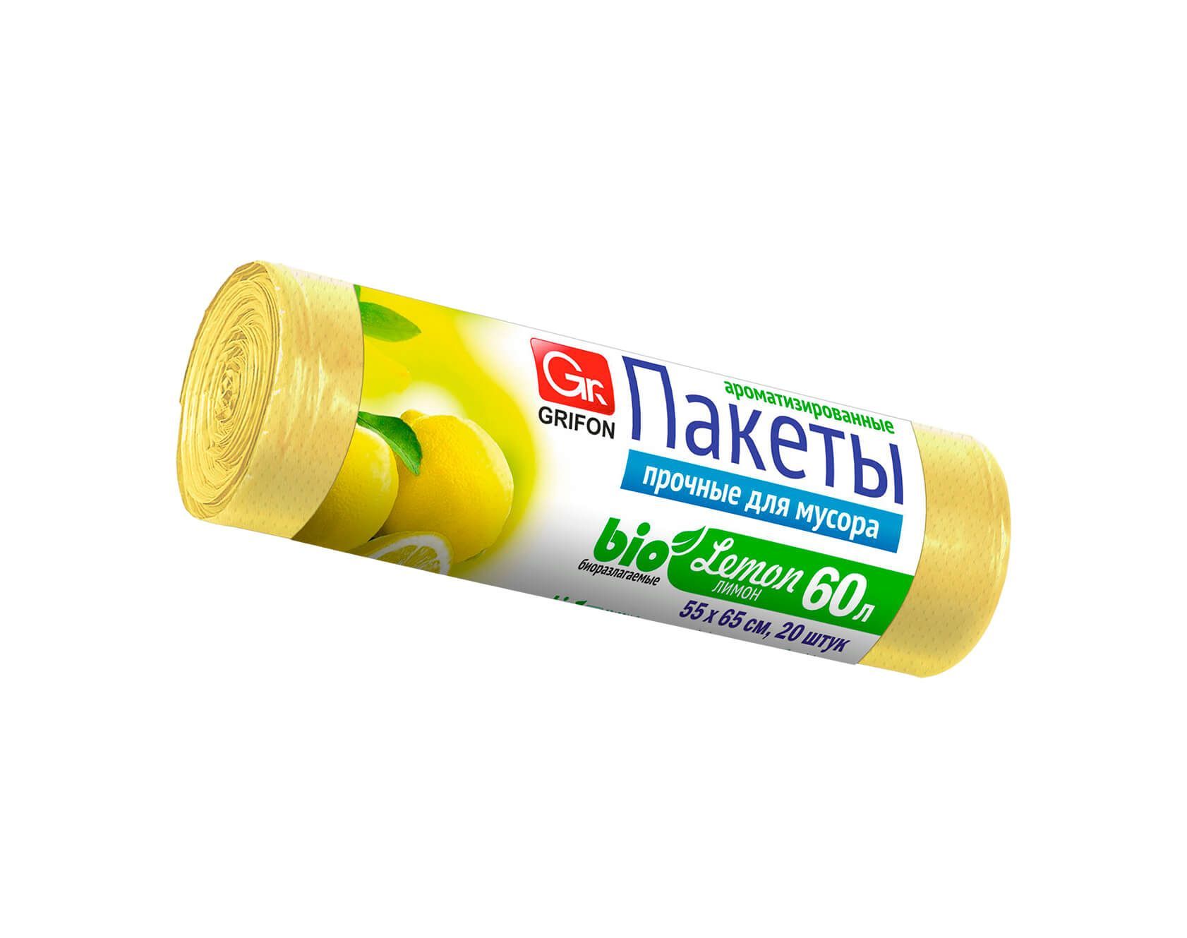 Мешки для мусора 60 л, ароматизированные, Лимон, желтые, в рулоне 20 шт., ПНД, 9 мкм, 650х550 мм, GRIFON Aroma, 101-023 Li