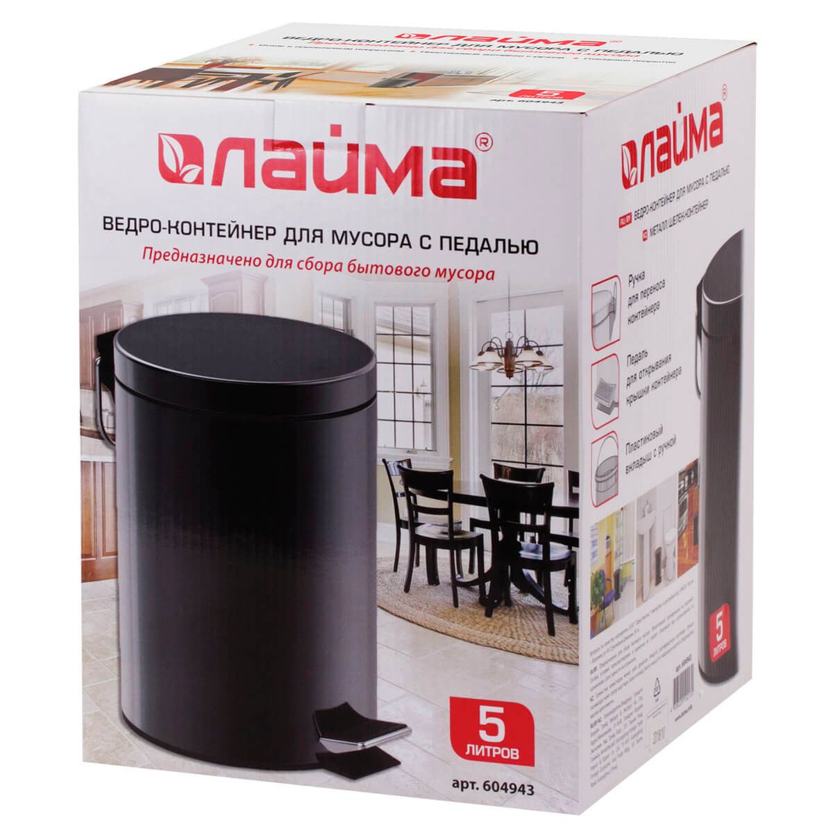 С вместимостью 5 литров, он идеально подходит для помещений с невысокой проходимостью. Удобная педаль для открывания и плотно закрывающаяся крышка обеспечивают надежную защиту от запахов.