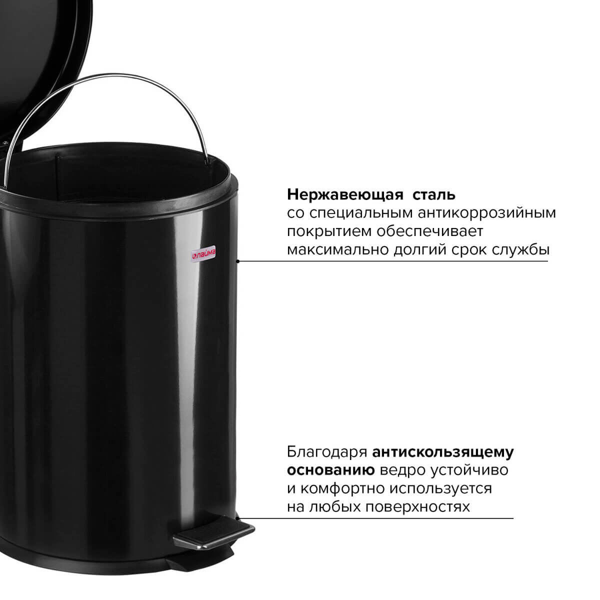 Внутреннее съемное ведро из прочного пластика снабжено удобной рукояткой для легкости выноса мусора. Изготовленное из нержавеющей стали с антикоррозийным покрытием, оно гарантирует долгий срок службы. Прочная конструкция с антискользящим основанием обеспечивает надежность в использовании.