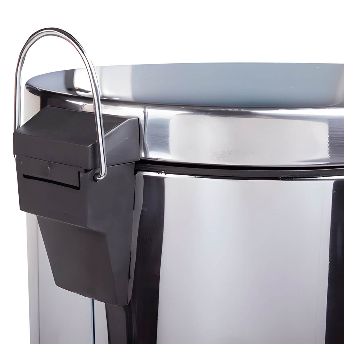 Внутреннее съемное ведро из прочного пластика снабжено удобной рукояткой для комфортного извлечения мусора. Изготовленное из нержавеющей стали с антикоррозийным покрытием, оно гарантирует долгий срок службы. Прочная конструкция с антискользящим основанием обеспечивает надежность в использовании.